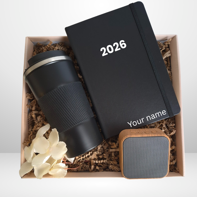 Organisez vos journées avec style grâce à ce coffret personnalisé : agenda avec nom, tumbler, gobelet isotherme et enceinte Bluetooth. Idéal comme cadeau original et pratique.